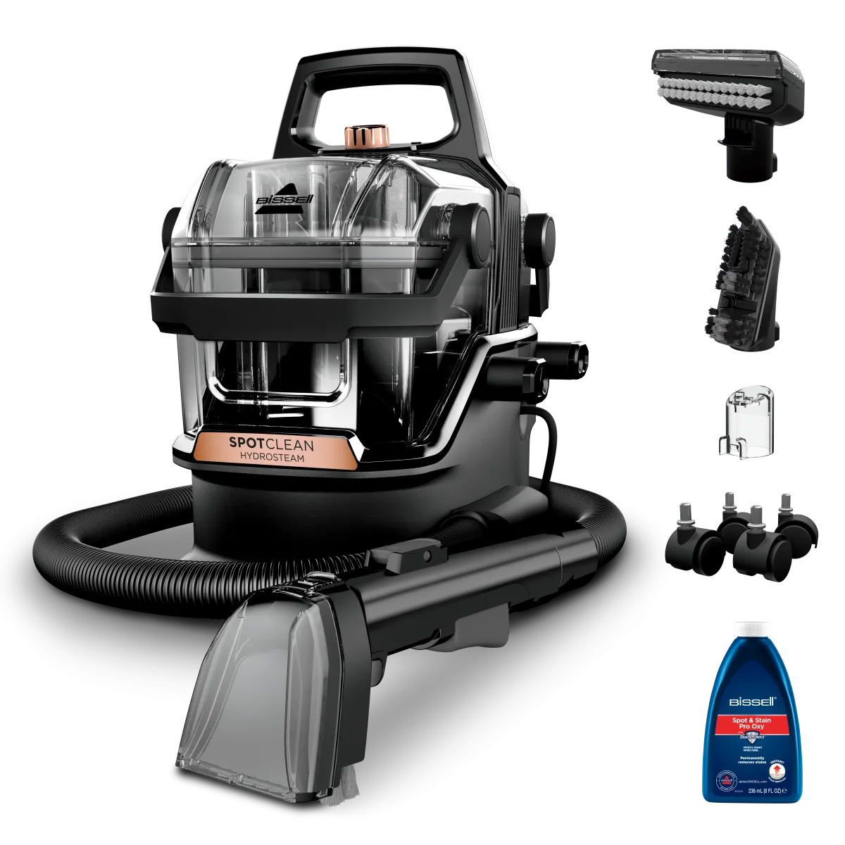 Bissell SpotClean Hydrosteam Pro tekstiilipesuris on HydroSteam-tehnoloogia, mis ühendab veeauru, vett ja spetsiaalset puhastuslahust, 3 eraldi puhastusrežiimi erinevateks ülesanneteks, kaks eraldi veepaaki puhta ja musta vee jaoks ning valik kasulikke lisatarvikuid.