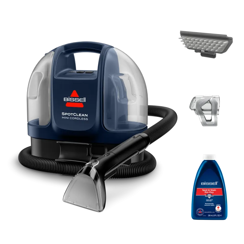 Bissell SpotClean® Mini Cordless Midnight Effect – juhtmeta, kompaktne lahendus väikeste plekkide kiireks ja mugavaks eemaldamiseks. Öine must mõju, tugev imemine ja lihtne kaasaskandmine — puhas tulemus, ilma juhtmeteta.