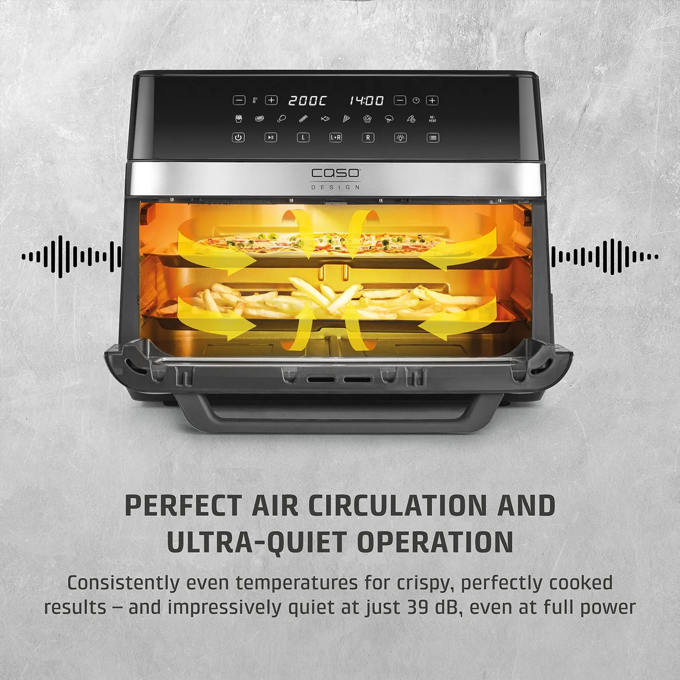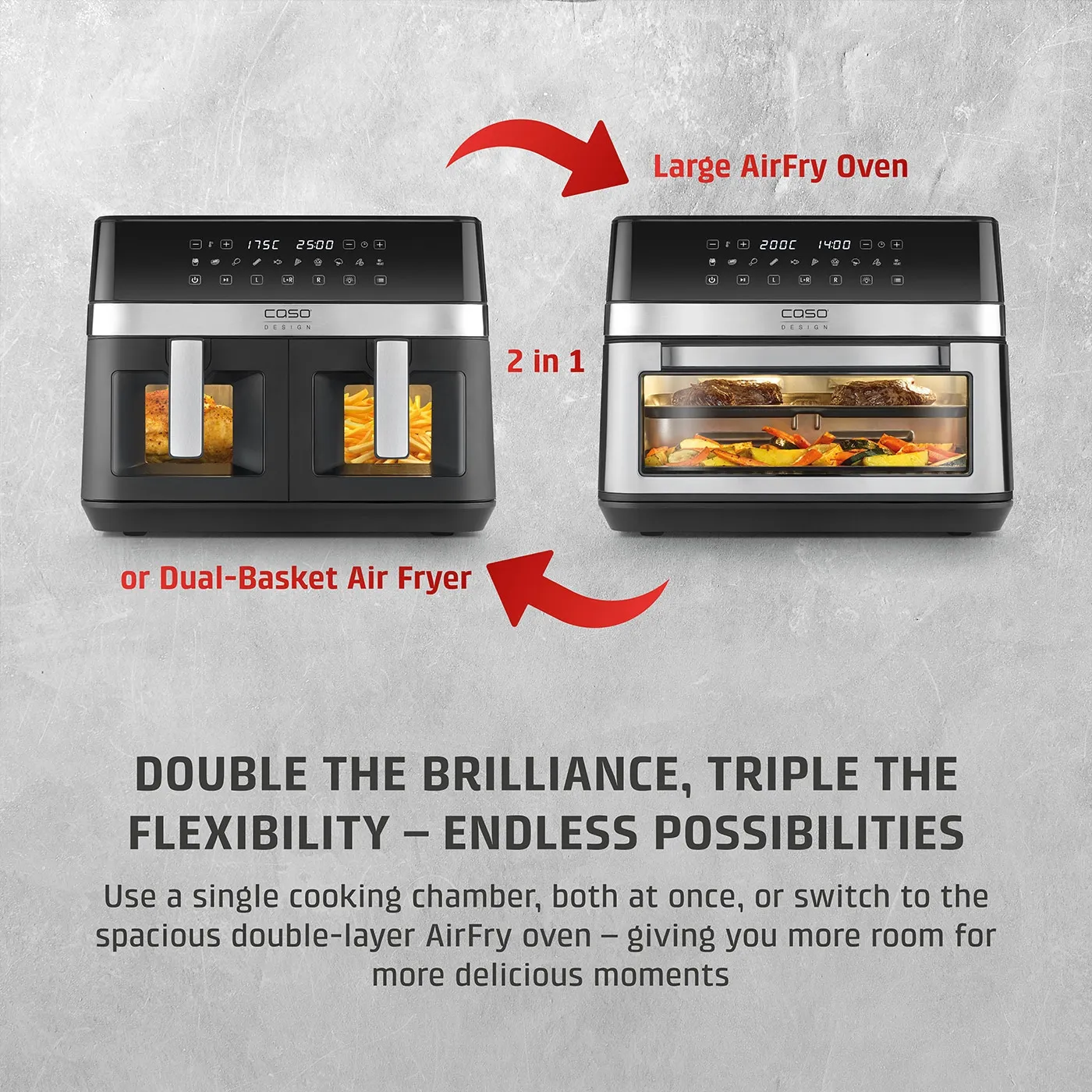 CASO AirFryer DuoChef – kahekordne kuumaõhufritüür 14L mahuga. Valmista tervislikku toitu kiiremini ja väiksema energiakuluga. 10 programmi, kaks korvi, BPA-vabad osad ja lihtne puhastada.