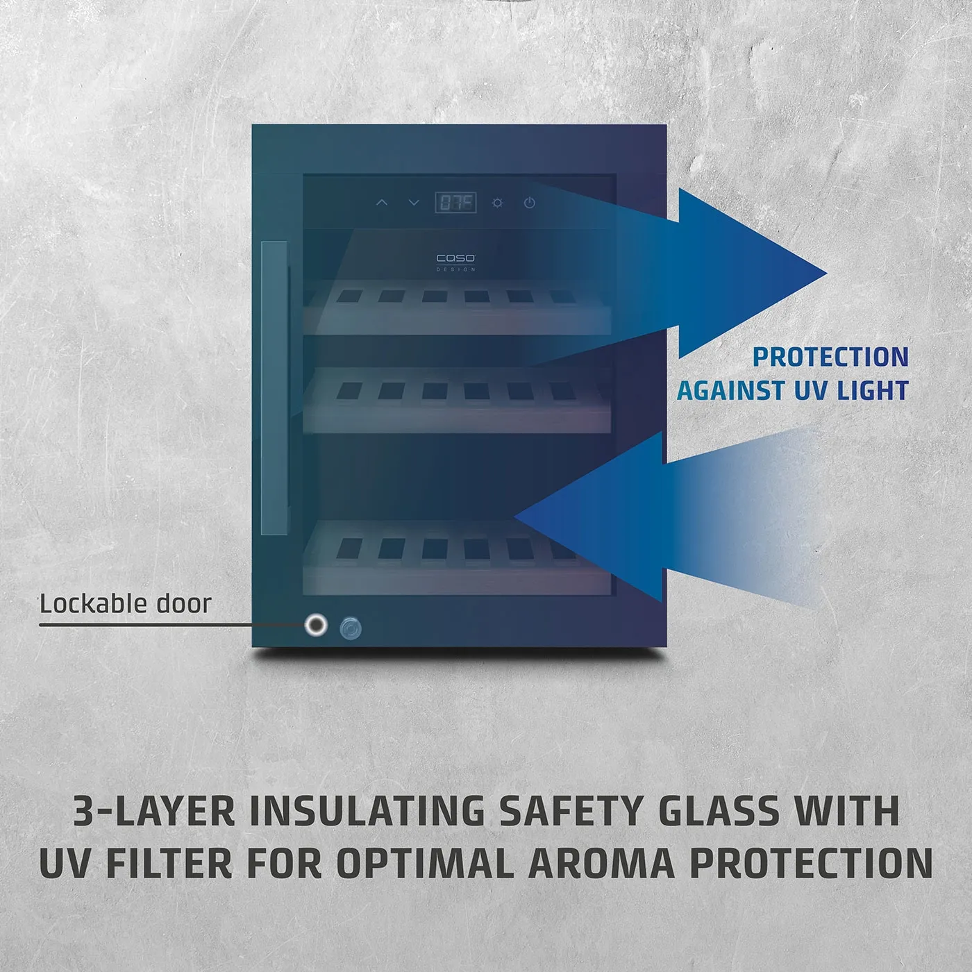 3-kihiline UV-filtriga turvaklaas pakub maksimaalset kaitset ja turvalisust. Lukustatav uks kaitseb veini soovimatu ligipääsu eest. Kolm eemaldatavat puidust riiulit, millest kaks on kuullaagritel, tagavad lihtsa ligipääsu ja elegantse esitlemise. Olgu tegemist punase või valge veiniga – CASO WineExclusive 12 hoiab iga pudeli täiuslikus seisundis ja õigel temperatuuril.