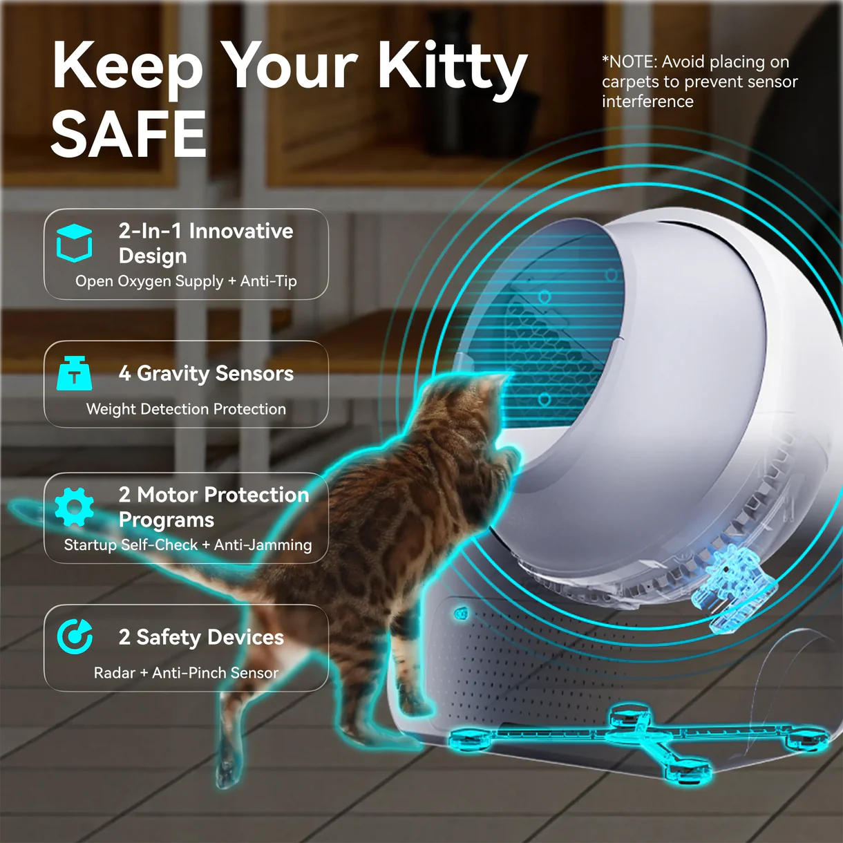 CATLINK Pro on varustatud mitme sensoriga, mis tagavad ohutu kasutamise. Kui kass siseneb liivakasti või tuvastatakse liikumine, peatub puhastustsükkel automaatselt.