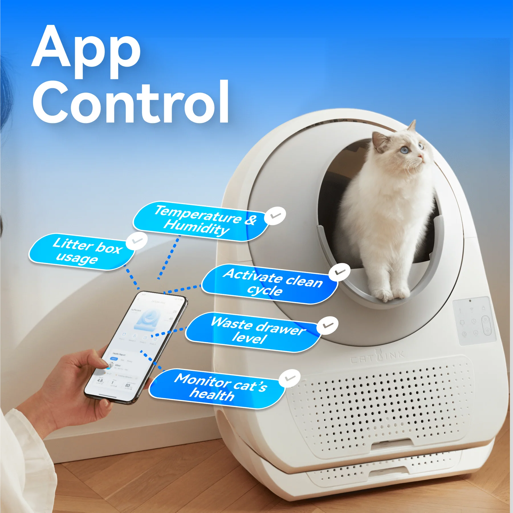 Liivakast ühendub WiFi kaudu CATLINK mobiilirakendusega, mis võimaldab jälgida kassi tualetikäitumist ja seadme olekut reaalajas.