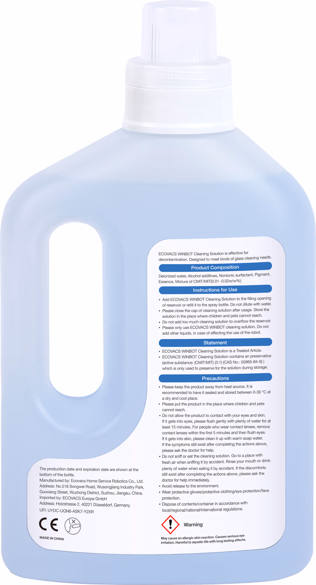 Kasutusjuhend: Vala ECOVACS WINBOT puhastuslahus veepaaki või pihustuspudelisse seda veega lahjendamata.