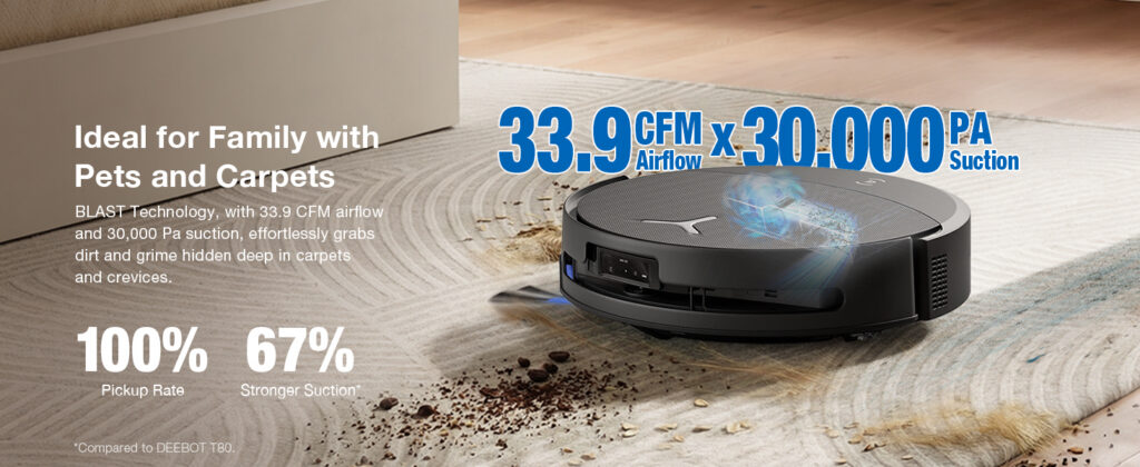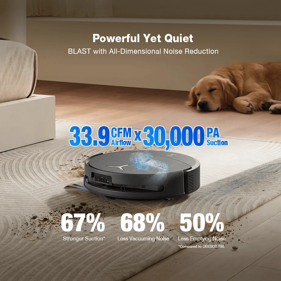 Põhjalike ümberkujunduste ja optimeerimiste kaudu põhiharja, puhuri ja õhukanali struktuuris saavutab DEEBOT märkimisväärse töömüra vähendamise – kuni 3 dBA tolmu kogumiseks ja 5 dBA tolmuimeja jaoks (kinnitamisel). See vastab müra intensiivsuse vähenemisele vastavalt umbes 50% ja 68%. Tulemuseks on palju vaiksem puhastuskogemus, mis suurendab igapäevast mugavust, avades samal ajal Boosted Large-Airflow Suction Technology (BLAST) täieliku potentsiaali võimsa ja kõrge efektiivsusega imemiseks, mis on võimas, kuid märkimisväärselt märkamatu, nii et saad puhastada ohutult ja häirimatult.