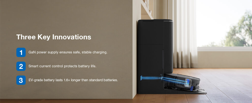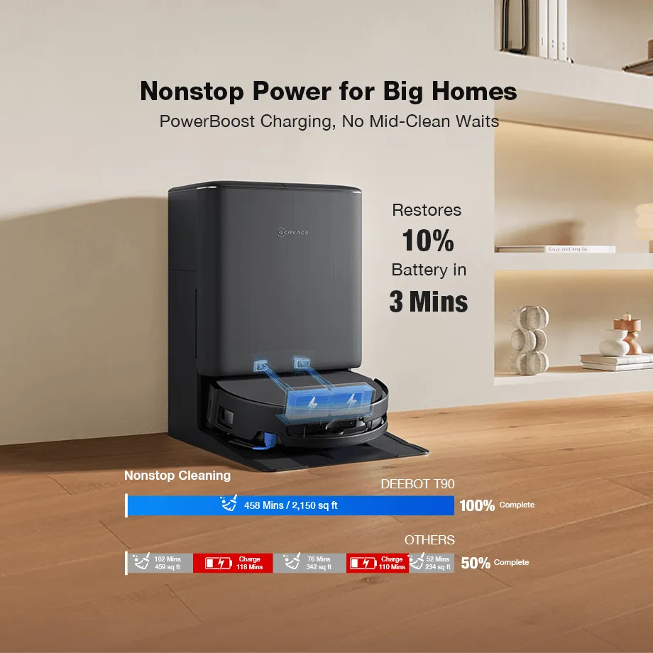 ECOVACSi eksklusiivne PowerBoost-tehnoloogia koos pideva tööajaga võimaldab katkematut puhastust väga suurtele pindadele.