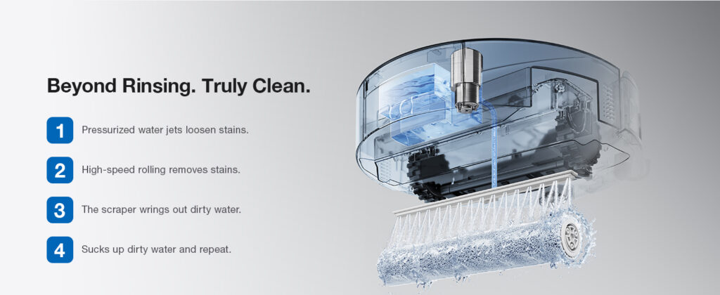 OZMO ROLLER 3.0 isepesuv mop on nüüd 50% pikem (27 cm), pakkudes laiemat ja tõhusamat katvust. Kõrgsurve veesüsteem puhastab rulli 16 täpsusdüüsi abil, eemaldades tõrksa mustuse.
