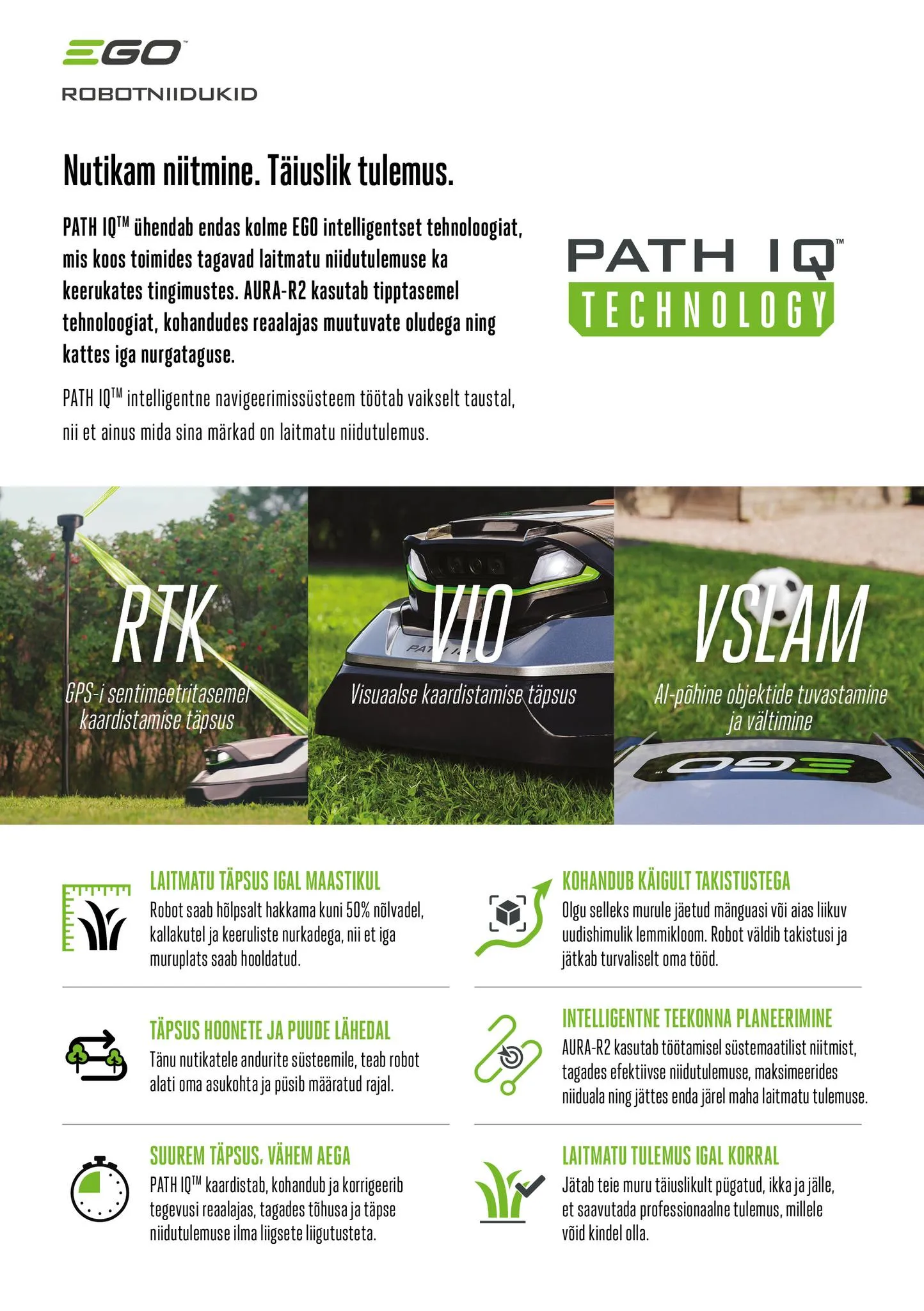Need tehnoloogiad töötavad koos, et kaardistada ja navigeerida teie aias sentimeetri täpsusega, planeerides tõhusad ja kattumatud niiduteed ilma piirdekaablita.
