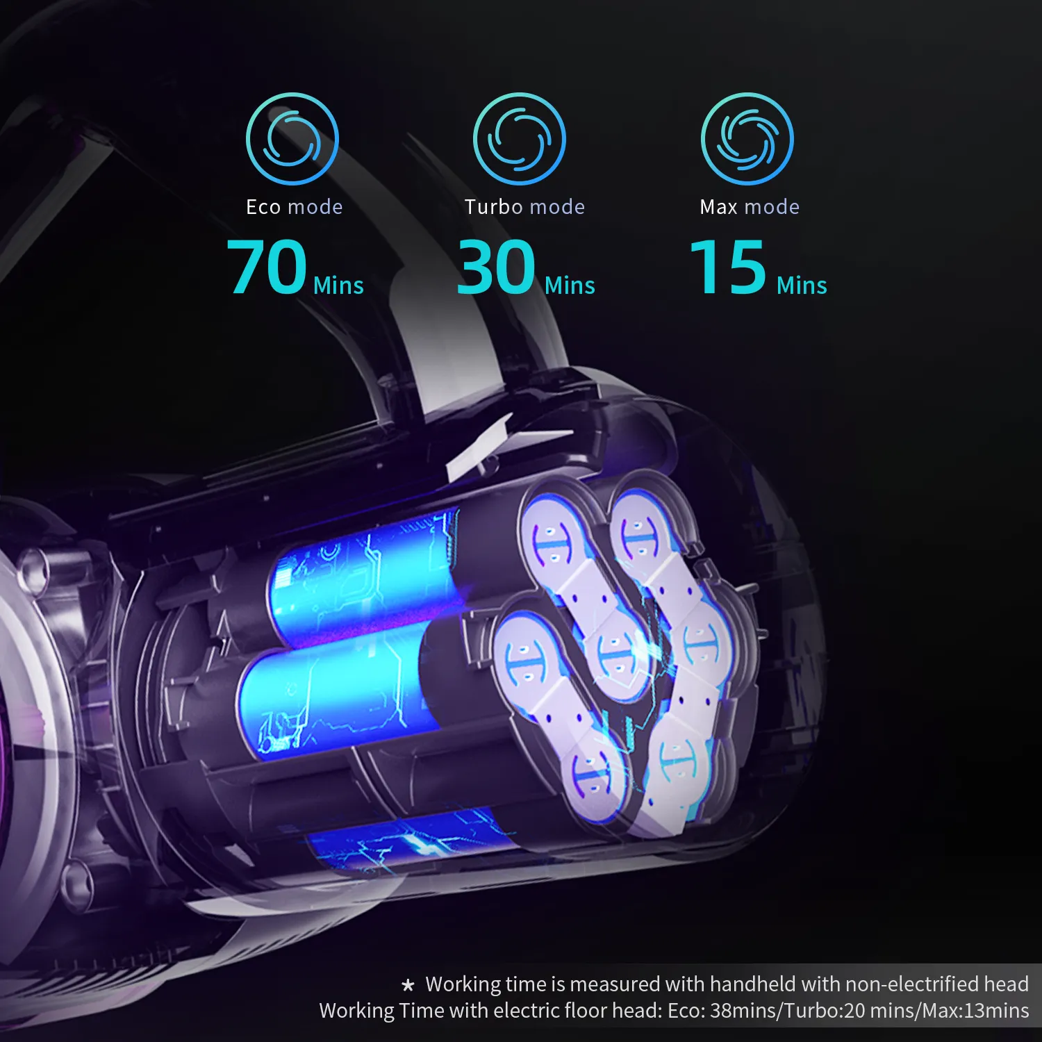 7 x 3000 mAh suure mahutavusega liitiumaku koos nutika energiahallatusega võimaldab seadmel töötada kuni 70 minutit ilma elektrilise harjata.
