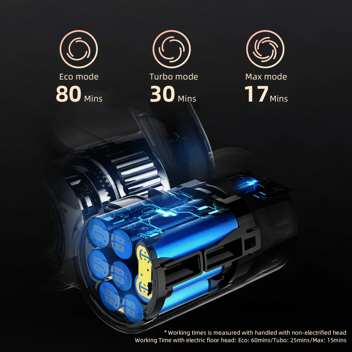 Pika tööajaga aku: kuni 80 minutit ilma elektrilise peatsita; teiste režiimide kestvus: Eco — 60 min (elektrilise peaga), Turbo — 25 min, Max — 15–17 min