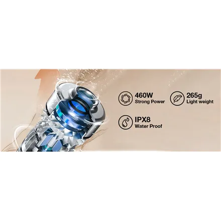 Kerge alumiinium-magneesiumsulamist mootor arendab 460 W võimsust ja saavutab IPX8 veekindluse taseme, tagades usaldusväärse ja tõhusa puhastuse erinevatel pindadel.