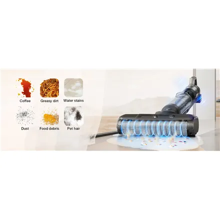 See juhtmevaba tolmuimeja ühendab 5 puhastusfunktsiooni ühes seadmes – tolmuimeja, mopp, märg- ja kuivpuhastus ning automaatse veepihustuse. 180° lamendatav disain võimaldab lihtsat ligipääsu raskesti puhastatavatesse kohtadesse.