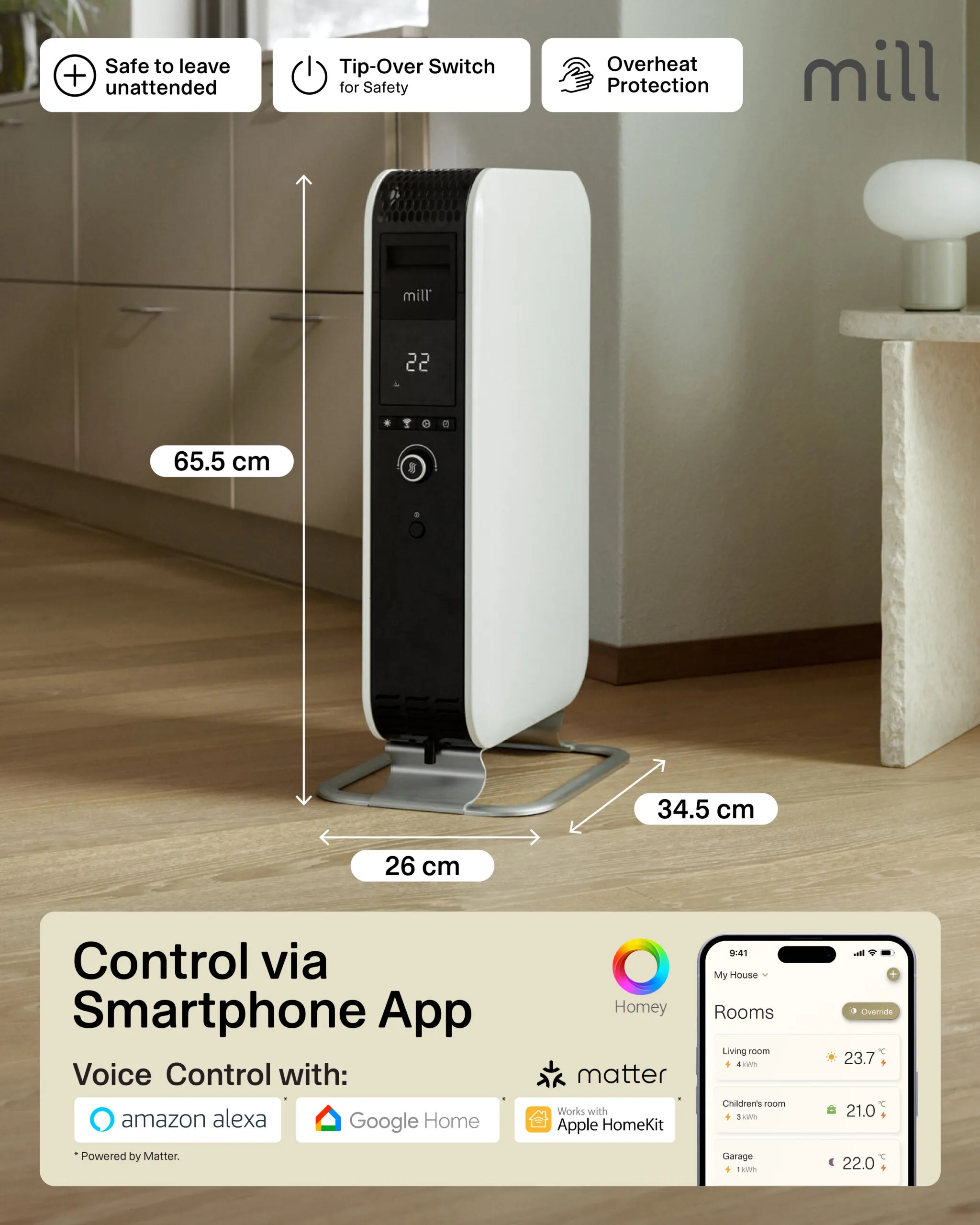 Mill WiFi küttekehadega saate mugavalt juhtida radiaatoreid oma nutitelefonist, tagades igal ajal meeldiva temperatuuri ilma liigset elektrit raiskamata. Õliradiaator ei ole kunagi varem nii hea välja näinud – kui tohib nii öelda! Mill Gentle Airil on elegantne, modernne disain ja tänu jalusele näib see justkui õhus hõljuvat. See stiilne ja kaasaskantav kütteseade on vaikne ning turvaline kasutada ka järelevalveta. Nagu nimigi viitab, on Mill Gentle Air õrn soojusallikas, mis ei põleta tolmu ega kuivata õhku.