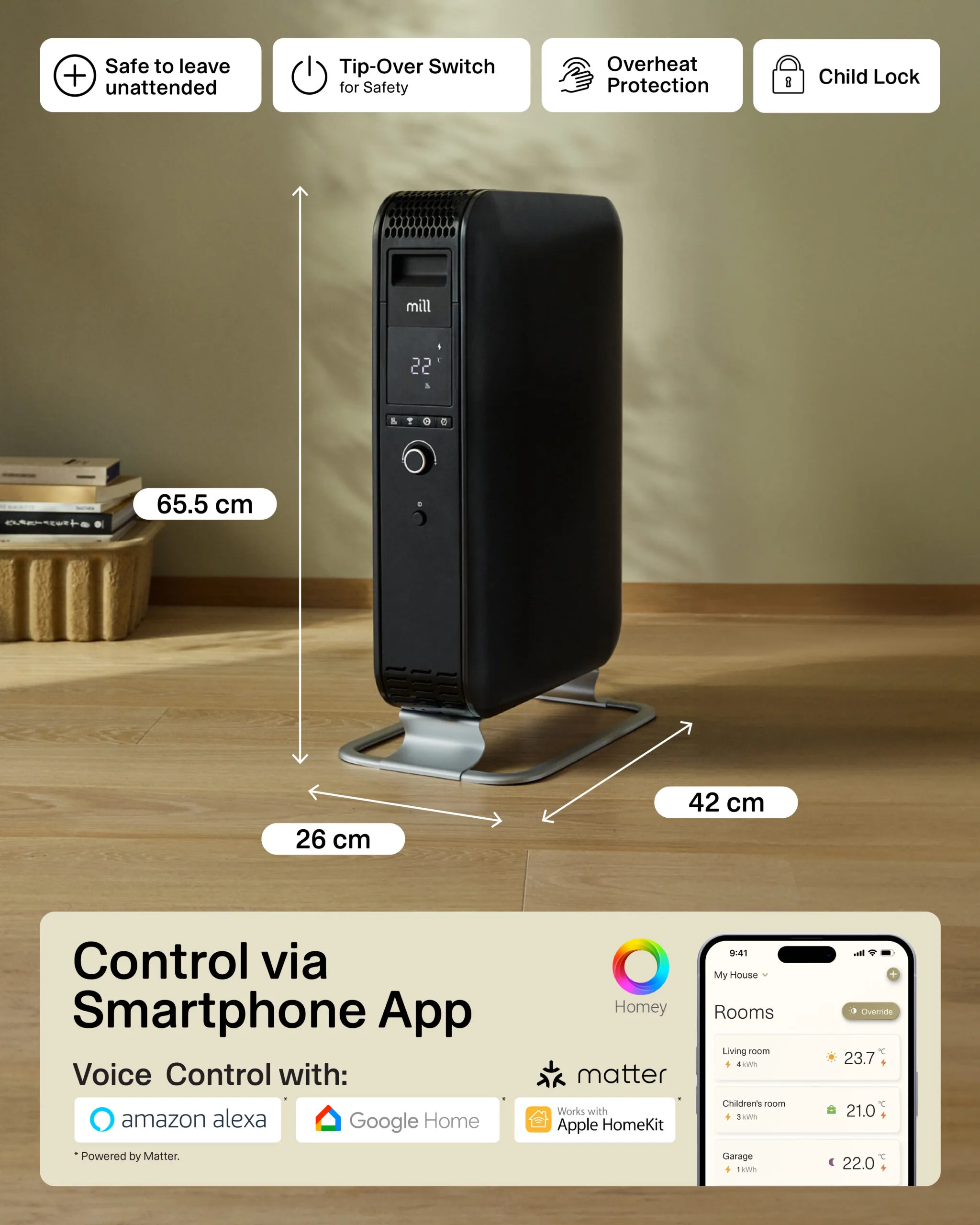 Mill WiFi küttekehadega saate mugavalt juhtida radiaatoreid oma nutitelefonist, tagades igal ajal meeldiva temperatuuri ilma liigset elektrit raiskamata. Õliradiaator ei ole kunagi varem nii hea välja näinud – kui tohib nii öelda! Mill Gentle Airil on elegantne, modernne disain ja tänu jalusele näib see justkui õhus hõljuvat. See stiilne ja kaasaskantav kütteseade on vaikne ning turvaline kasutada ka järelevalveta. Nagu nimigi viitab, on Mill Gentle Air õrn soojusallikas, mis ei põleta tolmu ega kuivata õhku.