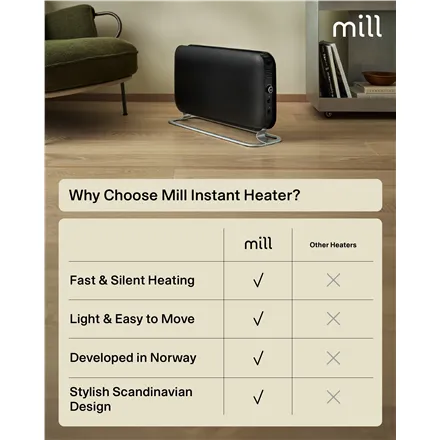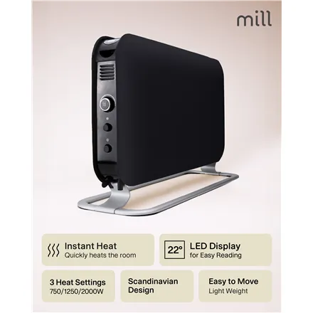 Mill Instant LED 2000 W – kiire ja vaikne konvektor, 3 soojusastet (750/1250/2000 W), elektrooniline termostaat, LED-ekraan, integreeritud ventilaator, 5-aastane garantii, skandinaavialik disain.