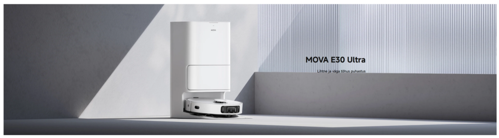 Mova E30 Ultra – võimas 7000 Pa robottolmuimeja nutika kaardistuse, vaibatuvastuse ja automaatse tolmukogumisega. Kuni 260 minutit tööaega, servast-servani puhastus ja rakendusjuhtimine tagavad laitmatu puhtuse ilma pingutuseta.
