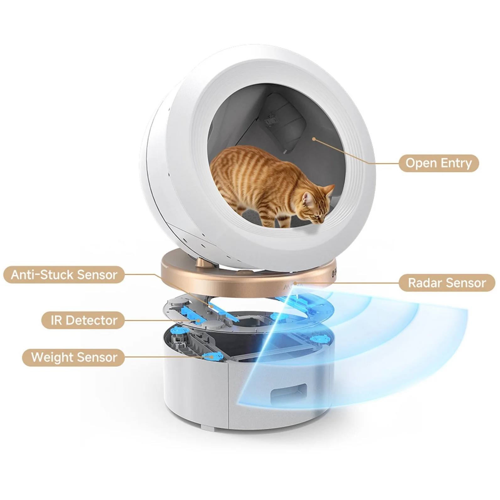 Liivakast on varustatud mitme intelligentsuse sensoriga (näiteks radar, kaalutunnus, IR‑detektorid ja vastupidavuse kaitse), mis tagavad turvalise töö, peatades tegevuse, kui kass viibib liivakasti lähedal või sees.