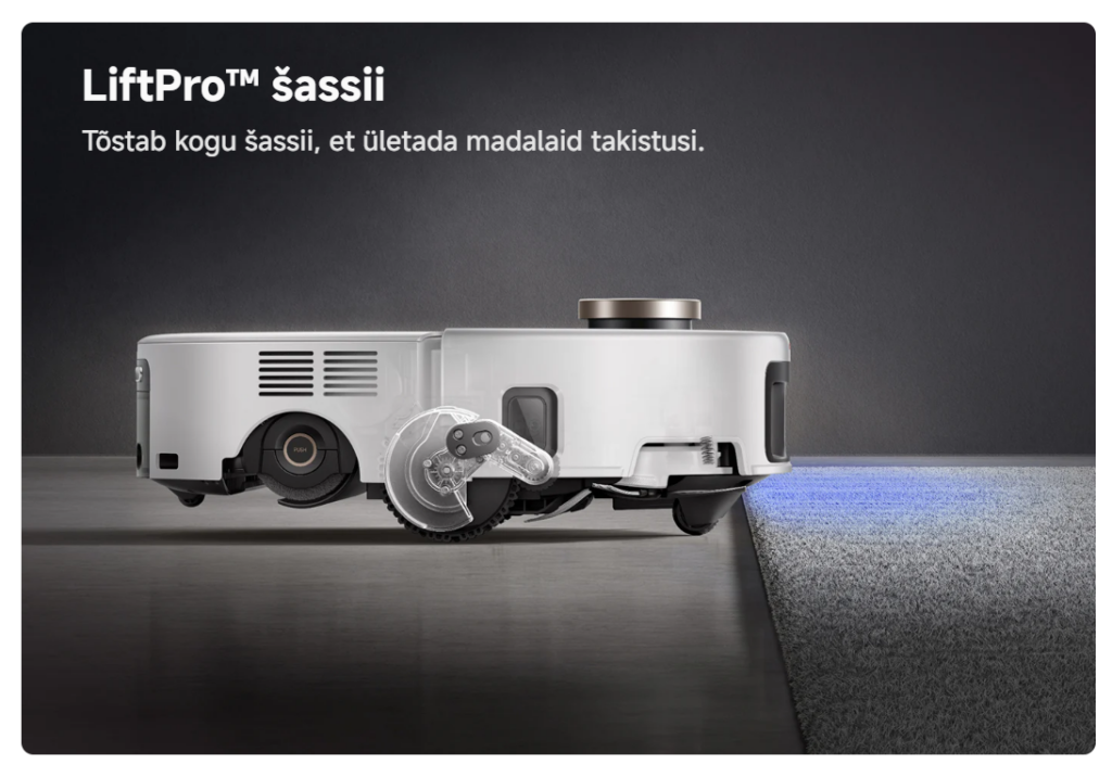 • LiftPro™ vedrustus tõstab roboti automaatselt, et vältida külgede takerdumist või moppi märjaks saamist tekstuursetel pindadel, nagu vaibad.