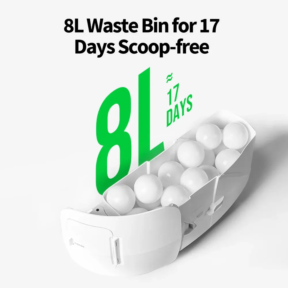 8-liitrine jäätmekast võimaldab kuni 17 päeva hooldusvaba kasutamist ühe kassi puhul, sobides hästi sageli reisivatele lemmikloomaomanikele