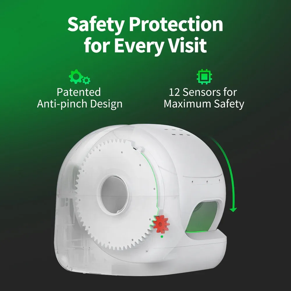 12 integreeritud turvaandurit tagavad maksimaalse ohutuse igal liivakasti külastusel, peatades automaatselt puhastustsükli, kui kass on läheduses või sees.
