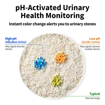 pH-tuvastusega granuleid sisaldav liiv muudab värvi reaalajas, kui kass urinatsioonil uriini koostises on anomaaliaid, mis võivad viidata uriiniprobleemidele nagu alumiste kuseteede haigused (FLUTD).