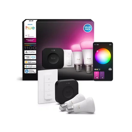 • Komplekt sisaldab: 2 × E27 LED lambipirni, Hue Bridge Pro, dimmer-lüliti, toiteadapter, vajalikud kaablid ja juhendid