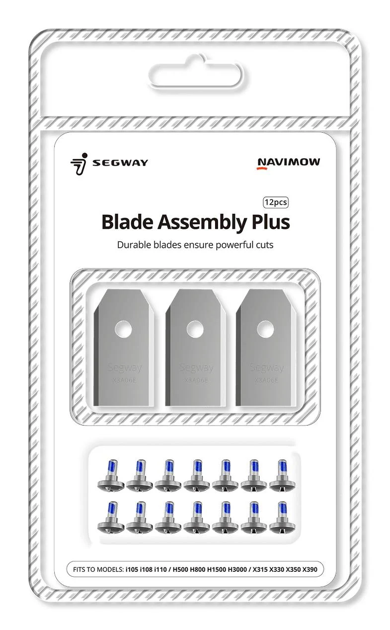 Segway Navimow Blade Assembly Plus – 12 süsinikterasest tera + 15 kruvi, kahepoolse lõikeservaga, sobib i-, H- ja X-seeria robotniidukitele ning tagab täpse ja tõhusa niitmise.