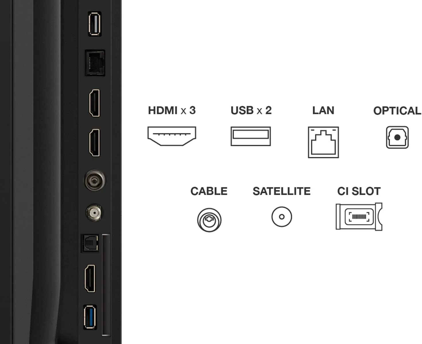 HDMI 2.1 (3x eARC), HDCP 2.2, USB 3.0, Ethernet LAN, WiFi 5, optiline digitaalheli väljund, RF satelliit, RF kaabel, CI pesa