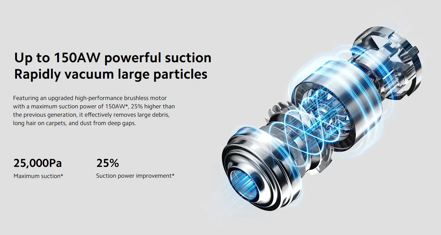 Võimas harjadeta kiire mootor tagab kuni 150AW imemisvõimsuse, suurendades tõhusust 20% võrra võrreldes eelmise mudeliga. Imemisvõimsus 25,000Pa. 25% suurem jõudlus.